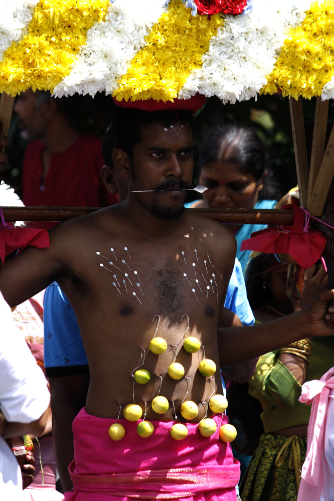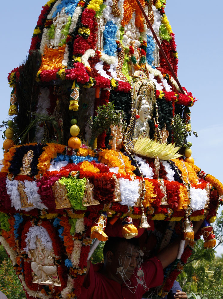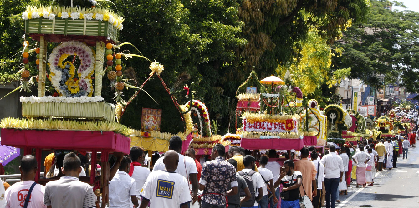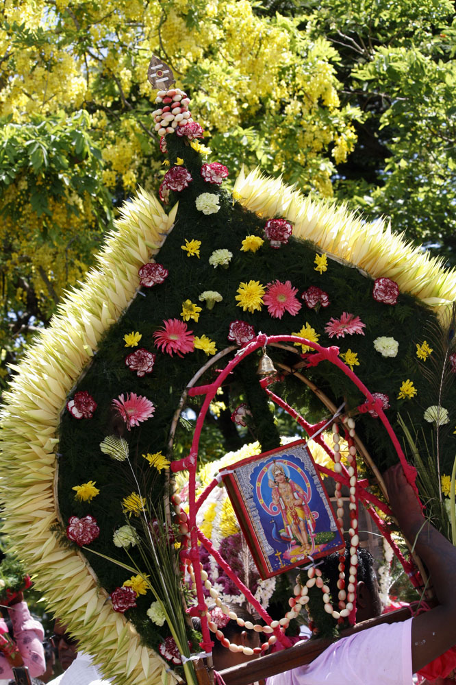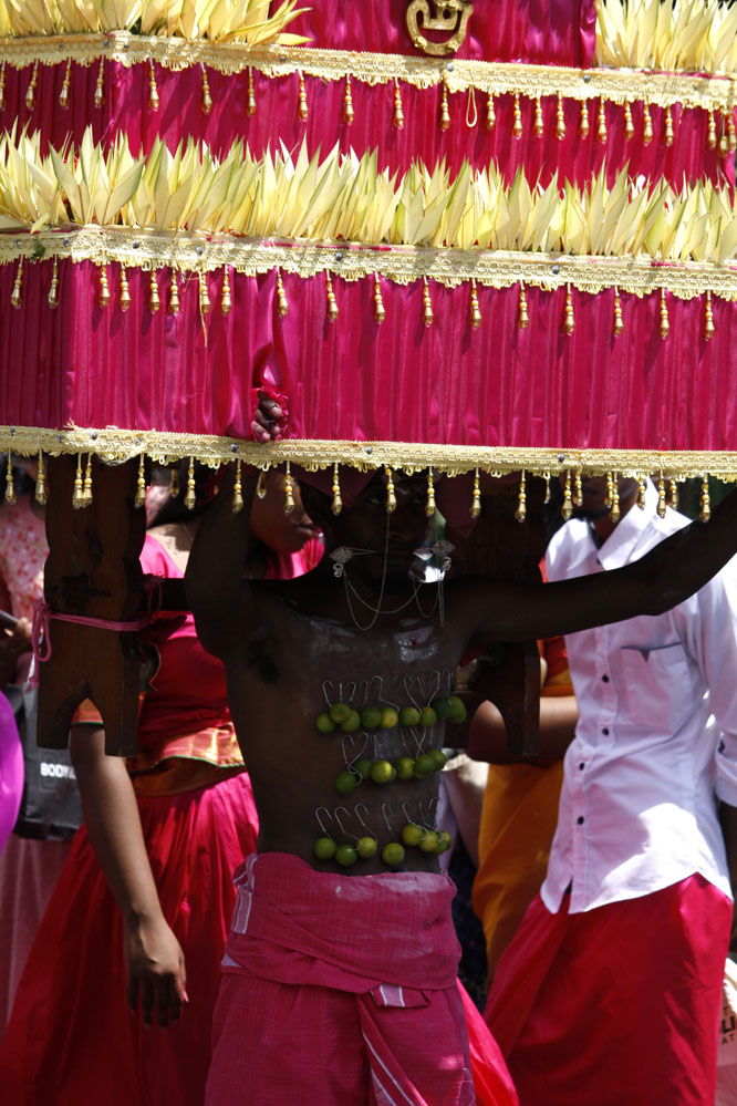 En Isla Mauricio, la comunidad tamil se reúne por localidades. Los más devotos, en agradecimiento, en búsqueda de fuerza y determinación o simplemente para renovar su fe, peregrinan descalzos bajo el sol ardiente, cargando una jarra de leche o un arco de madera (cavadee) que han decorado minuciosamente los días anteriores mientras han ido purificando sus cuerpos con una estricta dieta vegetariana.