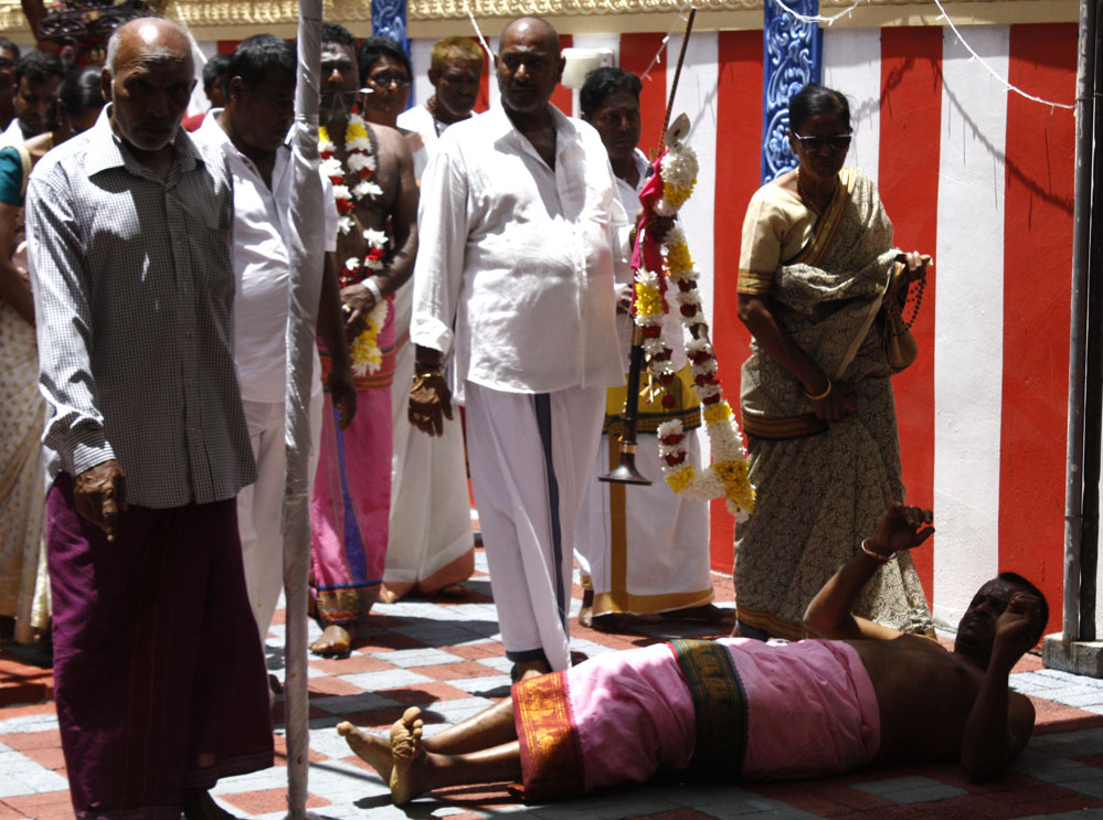Al final, la llegada al templo está cargada de emoción, algunos entran de rodillas o rodando el cuerpo, otros lloran, bailan, caminan en trance y hasta se desmayan. Cada cual concentrado en ese encuentro especial con su dios más importante. Ahí culmina la ceremonia, en el momento de recogimiento íntimo frente al altar, con litros de leche derramándose sobre la estatua de Murugam.